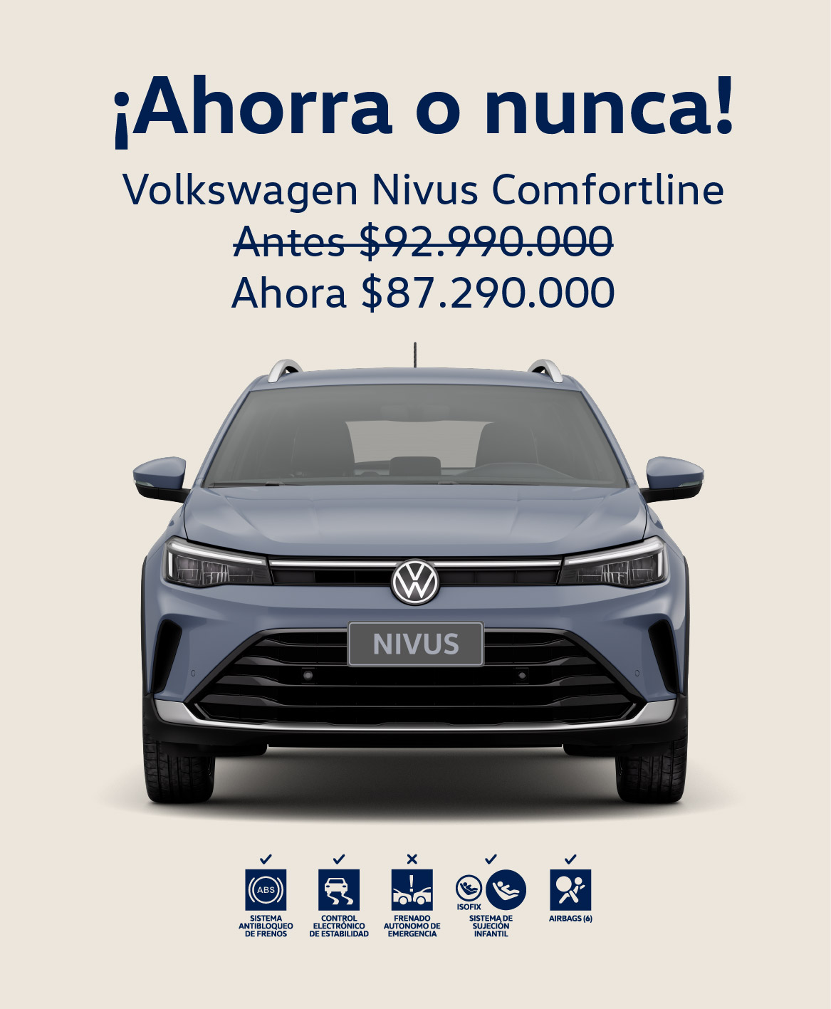 *imagen referencial. Precio desde $92.990.000 corresponde Nivus PA Comfortline 1.0L 200TSI 6AT 2026, precio desde $87.290.000 aplica solo con Porsche Movilidad y sus aliados. En inventario del concesionario mínimo de 3 unidades o hasta agotar stock disponible en el concesionario. Válido del 1 al 30 de septiembre de 2025. Aplica para unidades facturadas y matriculadas en el mes de septiembre2025.
